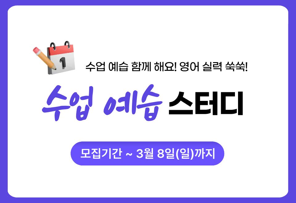 혼자 하기 어려웠던 수업 예습, [수업 예습 스터디]에서 함께 하고 영어 실력 빠르게 키워보세요!